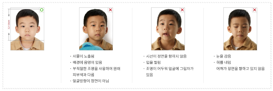 이 규격은 국제민간항공기구(ICAO)에서 정한 기준으로 규격에 적합하지 않은 사진은 접수 자체가 불가능합니다.